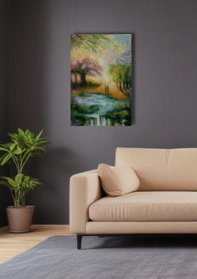 Jemný závoj růžových květů se snáší na schody, po kterých kráčí žena vstříc mostu. Most se tu stává symbolem přechodu – z minulosti do budoucnosti, z jednoho břehu života na druhý. Každý krok je vyjádřením odvahy a touhy pokračovat dál. Obraz vypráví o okamžiku, kdy se sen a realita setkávají uprostřed tiché přírody.