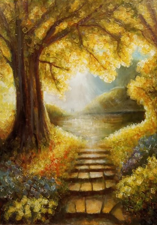 Žena kráčí po cestě zalité světlem, směrem k bráně, za kterou už minulost nemá moc. Vše kolem ní rozkvétá – příroda se mění v symbol nového začátku. Obraz je tichým poselstvím o odvaze opustit staré příběhy a vstoupit do prostoru, kde na nás čeká klid, přijetí a světlo.